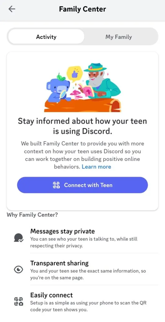 You’ll need the Discord app on your phone to set up Family Centre. Start by asking your teen for a Q.R. code, which you’ll scan with your app. After scanning, a connection request will be sent to your teen. They need to accept this request for you to view their activity details. Once connected, you can access the Family Center by tapping on “My Family” to see all connected teens.