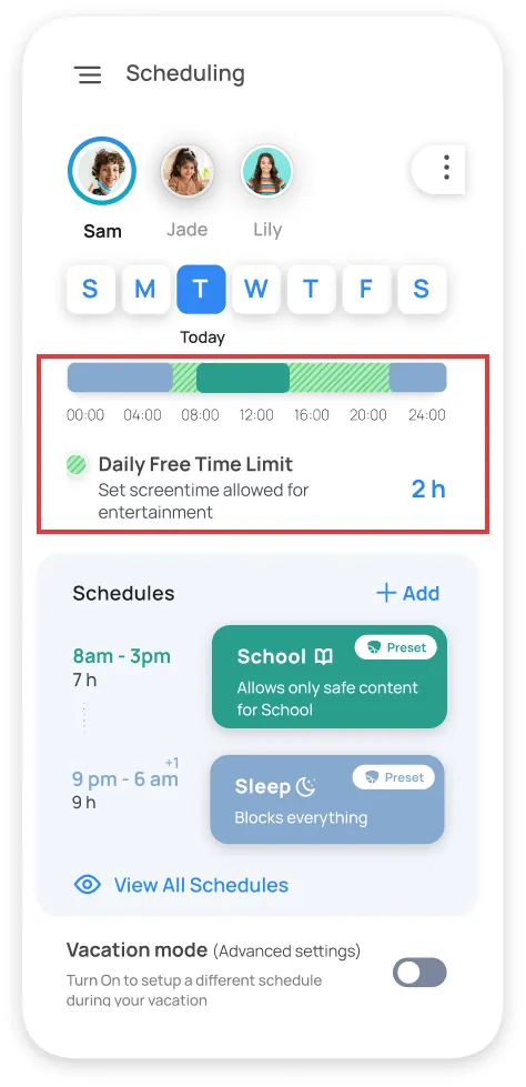 Screen time Scheduler: You can decide when your child can go online and when they can’t. So, during school time, homework time, or when it’s time to sleep, you can make sure they’re not using their devices.