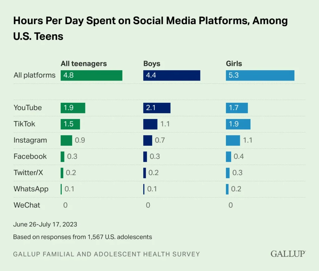 A survey by Gallup asked over 1,500 American teens about their social media habits. They found that more than half of these teens, about 51%, spend at least four hours every day on social media apps like YouTube, TikTok, Instagram, Facebook, and X.