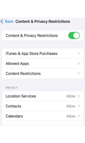 1. When Screen Time is enabled, go to Settings > Screen Time, then tap Content & Privacy Restrictions. If asked, enter your passcode, then turn on Content & Privacy Restrictions. You’ll only be asked to enter a passcode if you’ve already created one in Screen Time. Find out how to create a Screen Time passcode.